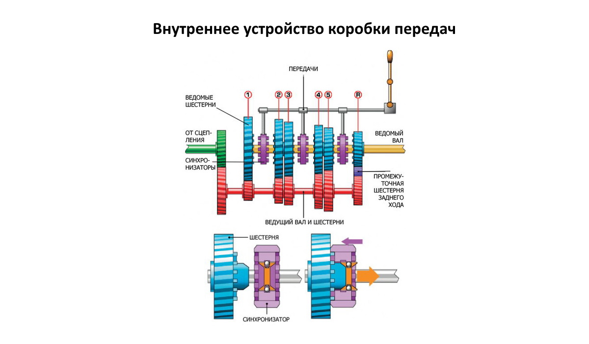 Синхронизаторы: Устройства, которые помогают выравнивать скорости вращения шестерен перед их соединением, что обеспечивает плавное переключение передач.